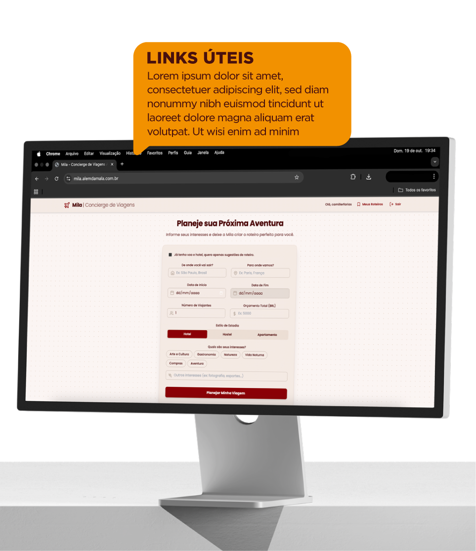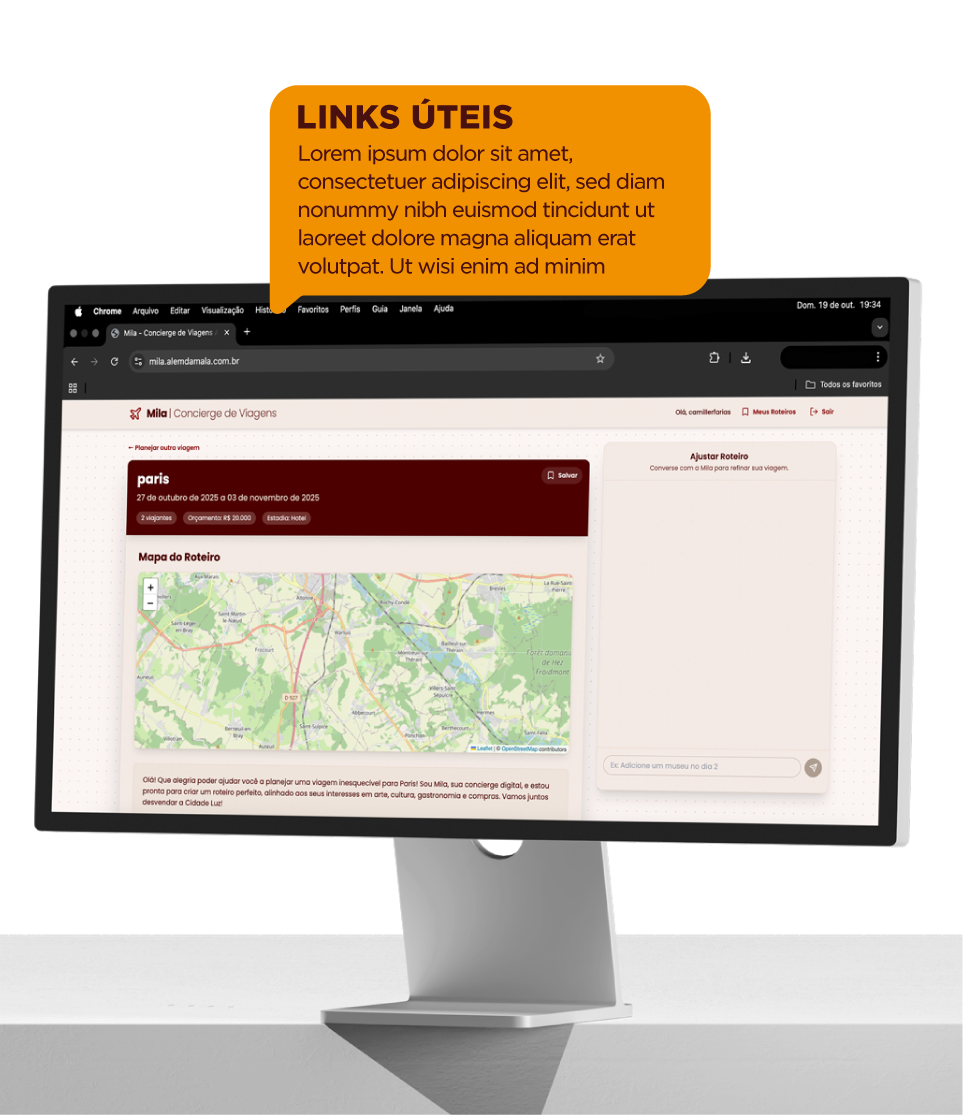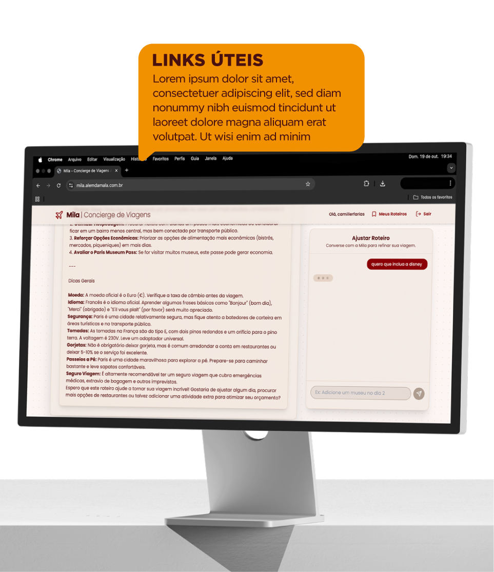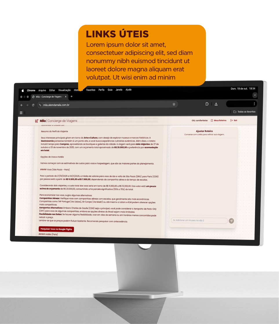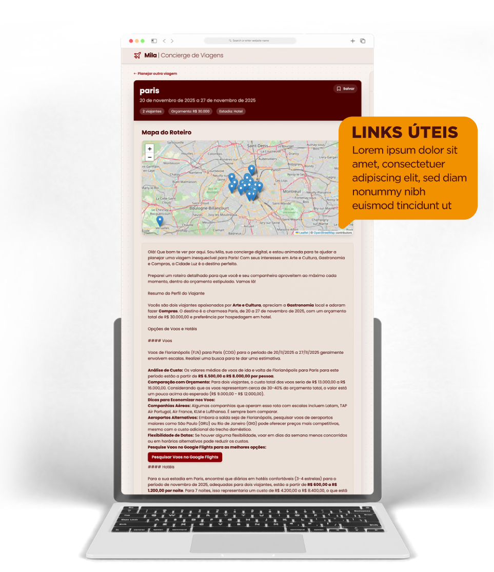Deixe a Mila cuidar do planejamento e aproveite um roteiro feito sob medida, com as melhores opções e links diretos para reserva.